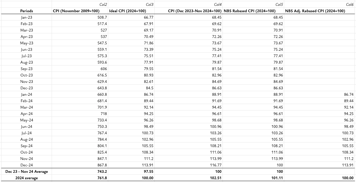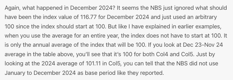 The table I shared then is posted below. Col5 was what the NBS initially released. This was wrong because of two things. First, you can see it aligns with Col4 except for the final month. The problem is that the NBS reported 2024=100 (which should be January to December 2024) as the base period but what they actually did was Dec 2023-Nov 2024. They lied but the worst thing they did was not following through. They manipulated December 2024 by making it 100.