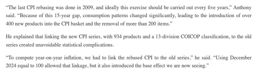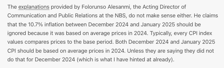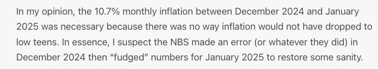 This makes no sense and it is hard to verify. I suspected that the NBS had to raise month-on-month inflation in January 2025 because not doing so would have dropped inflation too low. The problem is that the index number derived from this process is still maintained in the new series of CPI.